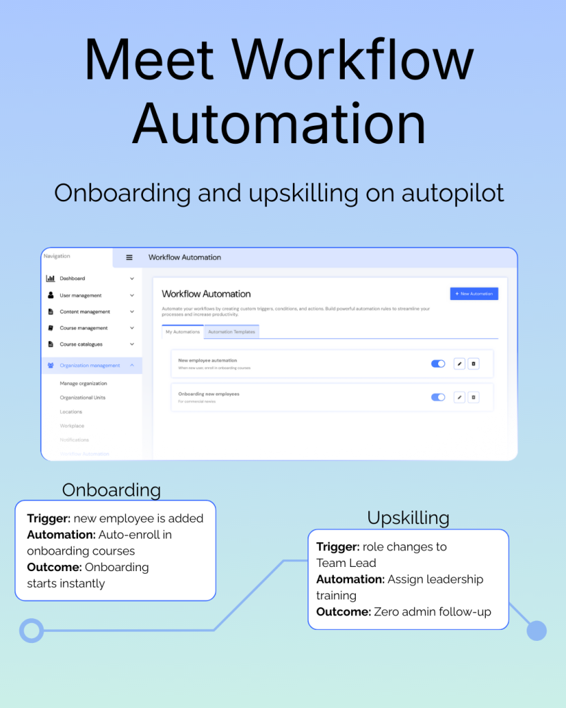 - Automations that save hours: Enrollments, reminders, certification renewals, and manager escalations run in the background.