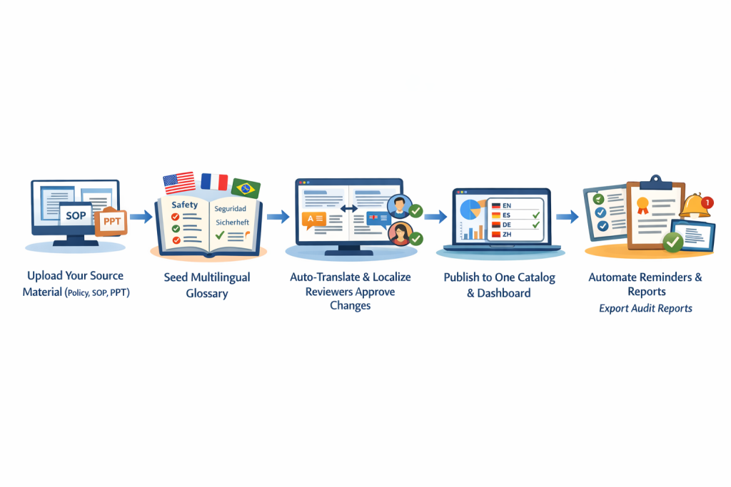 - Manual LMS translation creates delays, version sprawl, and QA headaches across SCORM files, PDFs, videos, and quizzes.