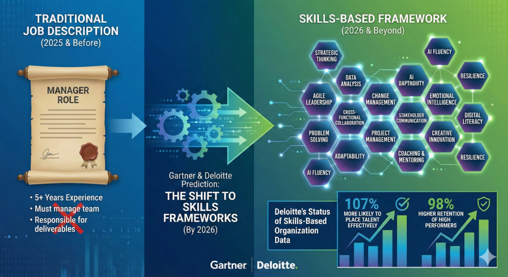 Gartner and Deloitte predict that by 2026, the traditional “Job Description” will be replaced by Skills Frameworks. Companies won’t hire for a “Manager” role; they will hire for a cluster of 15 specific skills. Deloitte’s Status of the Skills-Based Organization